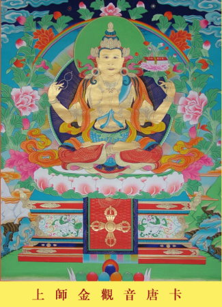 弟子訓琳、訓秀、智宣及智慧精勤致力於我金身觀音唐卡的工作,迄今已有數個月。經過了兩位畫師及三次的作畫,現在他們終於已完成一幅極佳的唐卡。此幅看起來很理想並且比之前所畫的兩幅好多了。