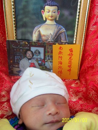 南無 如來、應供、正遍知、明行足、善逝、世間解、無上士、調御丈夫、天人師、覺悟者、世尊金剛蓮華佛! 二○○六年十二月下旬,在歷經了近九個月時間的美好等待後,內人玉慧終於出現了初步的宮縮,依照醫生的安排,我們於二十八號前往成都市婦產醫院住院待產。 今年懷孕的婦女特別多,可以說滿街都是準媽媽,而各個醫院的產科也是人滿為患,床位特別的緊張,沒法預約。因此到了住院部後,我們首先去問負責床位安排的護士站,護士長聽說我們是來待產的,在查看了記錄後對我們說:「今天剛好有一個房間正在辦理退床出院,是19號房,你們先在這裏坐著等一下,等房間消毒後就可以辦手續住進去了」。我們聽了非常的高興,在隨後等待的十幾分鐘裏,又有幾位準爸爸陪著準媽媽提著行李來問床位,在得知四樓已經沒有房間後,只好失望的提著行李到其他樓層去問(這裏房間的規格各層不同,自願選擇,四樓為單間較好樓層)。 辦妥各種手續後,我們住進了第19號房,首先我將 師佛的法相和藥師佛相及手澤聖符供奉在內人床的正上方,一家人向諸聖敬禮,祈禱加持。然後醫生帶著儀器來到房間為內人做了各種最後的產前檢查,由於內人的骨盆狹窄,雖然她自己希望順產,但是此前她的主治醫生再三講到可能會發生難產,因此在此之前一個月,主治醫生就為她制定了刨宮產手術的方案,這位醫生是該院乃至四川最好的權威,所以我們決定聽從醫生的建議。根據內人的病歷和目前的宮縮程度,主治醫生讓她當晚好好休息一下,第二天下午進行手術。 因為不巧在前幾天我感冒了,因此在安頓好內人之後,我決定請岳母大人當晚留院陪護,而我則去住家附近的另一家醫院,希望儘快把感冒治好。 在醫院看了醫生打了針回到家,打開電腦纔發現昨天給 上師老佛爺寫的信被退回來了。由於台灣地震,中國所有的海底豆腐光纜居然都被震傷了,這幾天大家上網都非常不便。於是我決定暫時不再打擾 師佛,待犬子生產回到家後,再向 師佛呈稟謝恩。 當晚,吃了感冒藥後昏昏欲睡,於是就早睡了。在這舒舒服服的一夜裏,在無造作中,我作了三個夢:第一個夢,夢到在一座山上,陽光明媚中,一位很健康的老太太懷抱著一個一兩歲大的小男孩在等著我,我們沒有對話,只是我對老太太懷中的小寶寶非常喜歡,他的穿著很特別,頭戴一頂深藍色的瓜皮帽,身穿一件深藍色的中式長衫,腳穿布鞋。小男孩對著我笑,表現得非常高興,我看到他時,也非常喜歡,於是拿出棒棒糖逗他玩。第二個夢,我夢到和 師佛在一起,師佛拿出一枝雪茄,我馬上掏出打火機為 上師點上,然後 上師怡然自得的吸了幾口,隨後很高興的稱讚。天快亮時,我慢慢醒來,一看才五點鐘,於是又迷迷糊糊的睡去,在半夢半醒中,彷彿聽到睡在隔壁房間的家母對我說:「今天在產院房間,有一床金色的羊毛毯從天而降,蓋在了慧妹的身上」。我在迷糊中還回答了一聲。 說來真是 恩師金剛蓮華佛的巨大加被,在二十八號(農曆臘月初九)入院以後,成都的天空就開始下起了久違的綿綿細雨,入冬以來久未下降的氣溫也終於開始明顯降溫,乾燥的空氣也隨之而轉為和潤宜人。這樣的天氣一直持續到我們出院那天,在我們辦理完出院手續步出住院部回家時,不僅早早的就風停雨住,地面乾透了,而且露出了溫和的陽光。特別的是我們入院時,房間號是:19,而內人也是該院第111719位產婦(經我詢問,住院號尾數的19與房間號19無關),而當天下午我去另一家醫院看醫生的門診號竟然也是19。同一天出現三個19號,我覺得,這不能不說是一種來自冥冥之中的暗示。當然,我更認為這一切都是來自於 師佛金剛持林上師的慈悲加持。從三個數字在同一天出現的「巧合」,我預感到內人的生產一定會如前次家母手術蒙 上師加被順利那樣,也一定會非常吉祥如意的! 第二天一大早,我匆匆趕去做了肌肉注射後,忙又趕去了產院。進到病房,內人告訴我昨天我走後,醫院宣傳部長帶來了兩名記者,他們是西南四省發行量最大的《成都商報》記者,他們想要作一期關於幸福母嬰的專題,所以到這家成都市最好的婦產醫院來採訪,宣傳部隨機抽到了我們的房號,所以他們會全程採訪我們的生產,並在下一期的期刊中刊登發表。 我對內人說:「你看,我們寶寶還沒來到人間,就已經有人預約要來採訪啦,我們寶寶一出世就成了小明星了,看來這小子還真有點人緣」! 正說著話,女記者和男攝影師拿著設備來到了我們房間,首先採訪我,請我談談現在的感受。女記者問道:「一般的準爸爸都會很激動,但是我看您卻十分的平靜安詳,請問您為什麼會這麼平靜呢?」我禮貌的笑了笑,然後對他們娓娓談起關於我們的信仰和由信仰而產生的種種力量與安樂。記者們聽到了,都油然生起對佛法的敬意。 午後兩點鐘,護士和護工來接內人準備去手術。我們一大家人和專門請假趕來的好朋友周建先生一起,坐電梯來到了六樓。內人被護工用輪椅送進了手術室。而我們所有人,和一直跟蹤採訪的兩名記者一起被院方要求到七樓的茶舍等候。小小的茶舍沒有其他客人,我們就三兩一桌的坐下來喝茶以靜候佳音。 我靜靜的坐在角落,拿出 師佛賜予的念珠默默的誦持觀世音菩薩心咒,男記者趁機又為我照了一張,然後就退坐到一旁,邊喝茶邊等待內人出來後採訪她的心裏感受去了。而女記者則又坐過來,希望我能為她多講講關